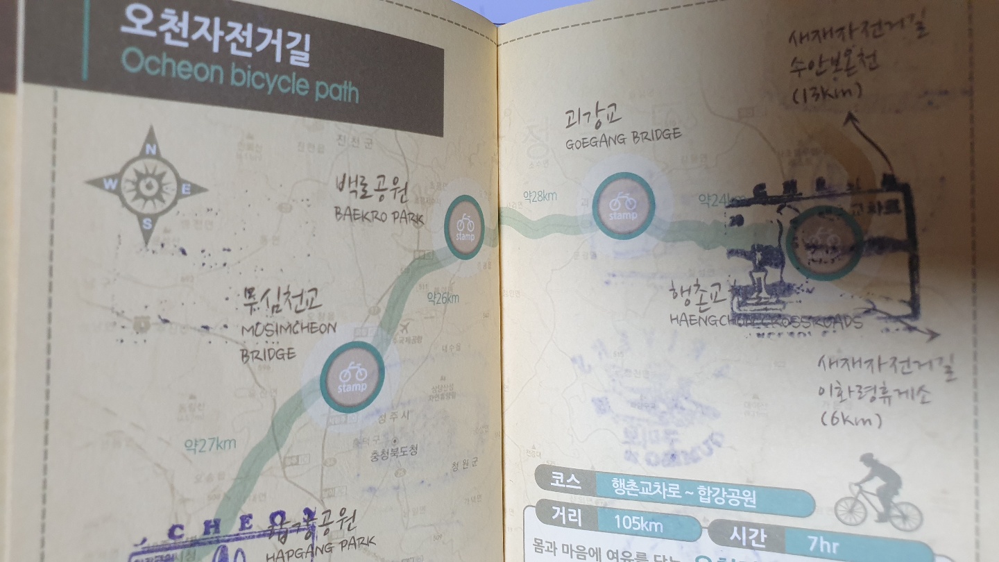 지난 포스팅에서는 북한강 자전거길을 알아보았습니다. 이번에는 오천 자전거길 서울에서 가는 방법에 대해서 알아보겠습니다. 오천 자전거길은 저에게는 약간 애증의 구간입니다. 오천 자전거길은 금강 자전거 종주길과 새재 자전거 종주길을 한 다리씩 걸치고 있기 때문입니다. 아래의 사진은 저의 인증수첩을 찍은 사진입니다.