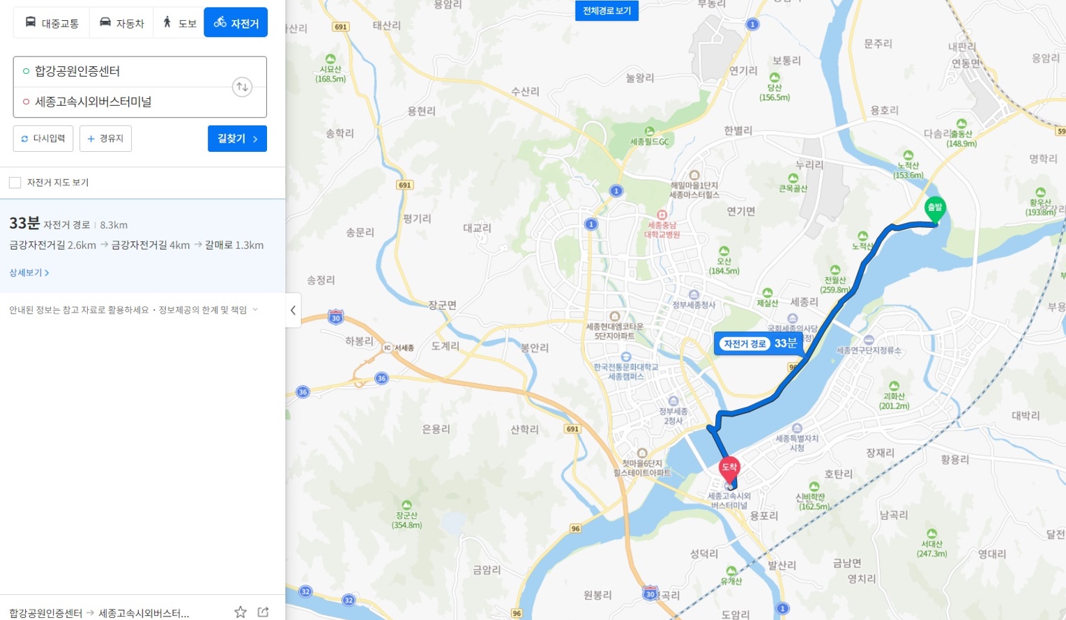 합강공원 인증센터에서 세종고속시외버스 터미널까지 자전거로 약 30분정도 소요됩니다. 여기서 버스를 타고 서울로 복귀하면 됩니다.
