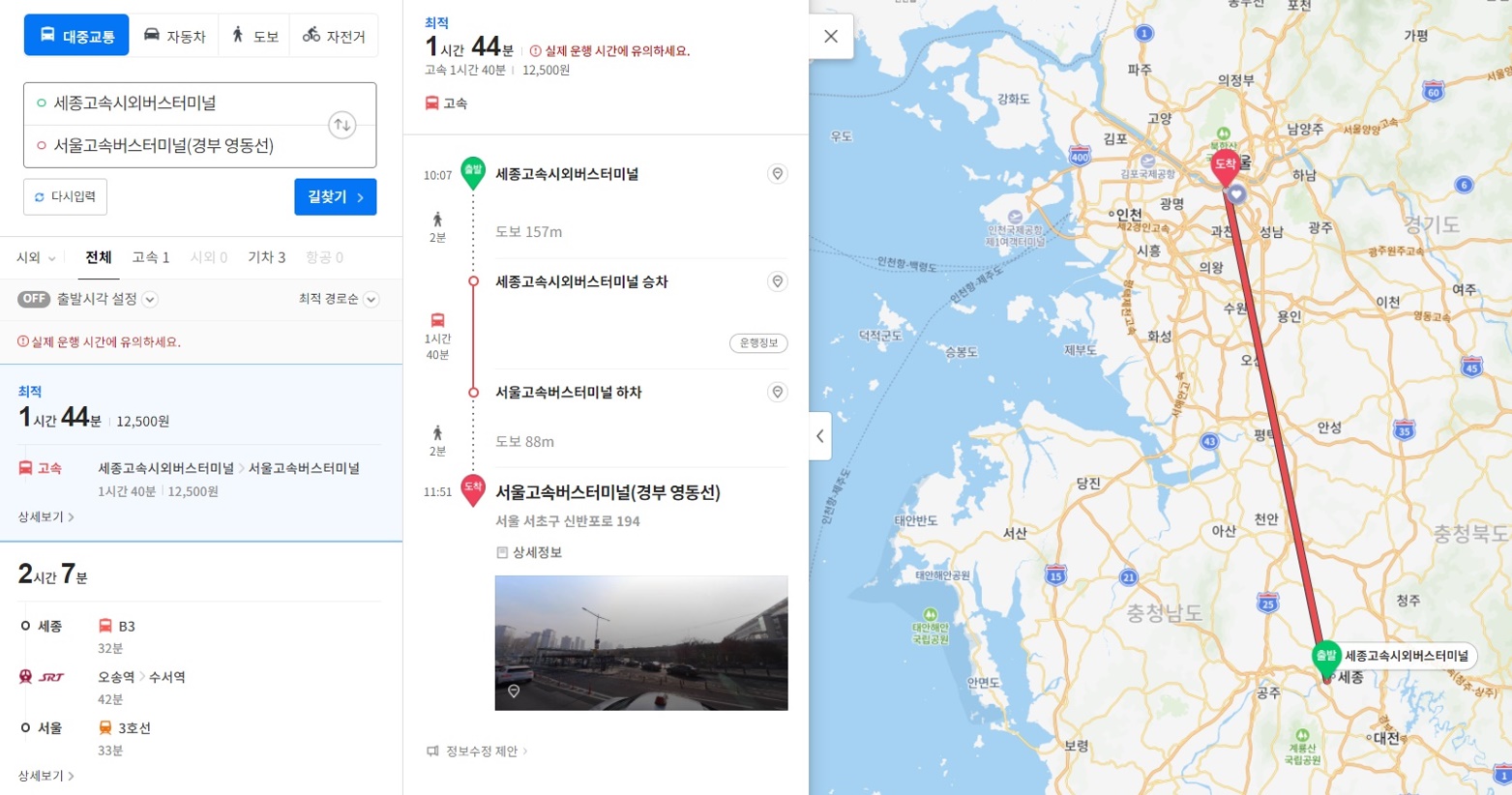 세종고속시외버스 터미널에서 서울 강남고속버스 터미널까지 버스 노선이 있기 때문에 간단하게 복귀할 수 있습니다. 돌아오는 길 역시 버스에 타기 전에 자전거 바퀴를 탈거하고 수화물칸에 실은 후 탑승하시면 됩니다. 버스 차비는 12,500원정도 소요됩니다.